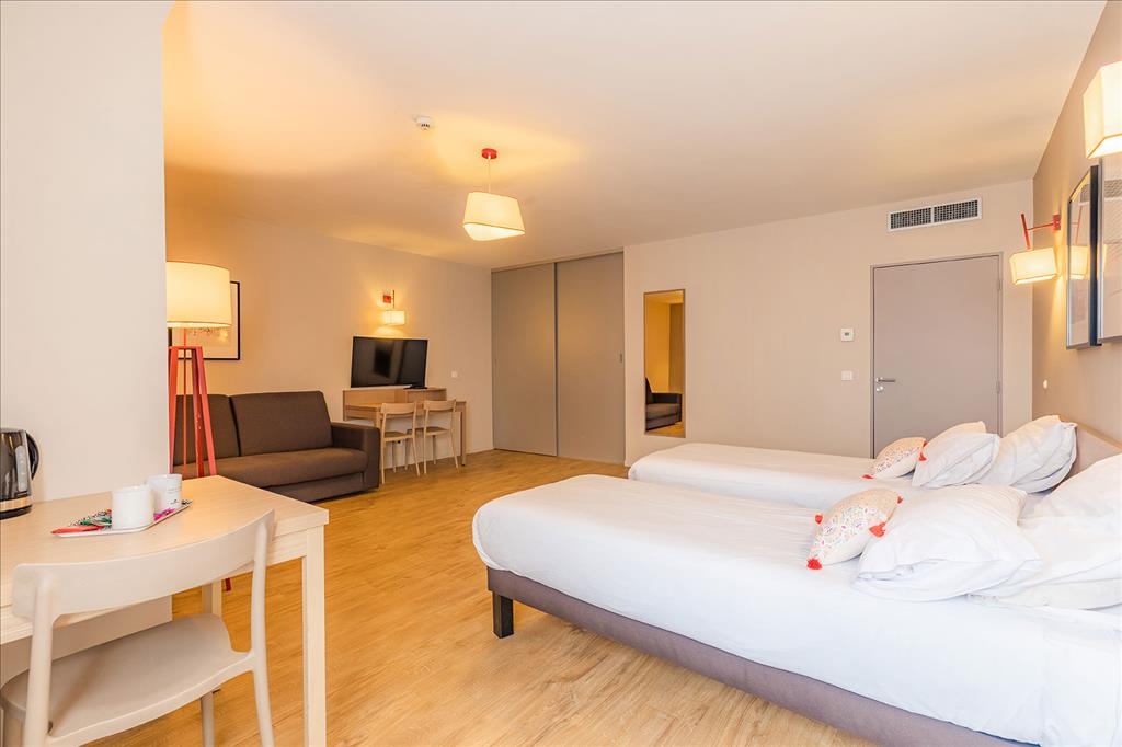 Vous serez chaleureusement accueilli dans des studios ou appartements 2 pièces pouvant accueillir jusqu’à 4 personnes. Décorés avec soin, certains appartements aménagés sous les toits offrent un style mansardé plein de charme. Vous y trouverez tout le confort et les équipements nécessaires pour vivre un séjour en totale indépendance. Chaque logement est doté d’un espace de travail ainsi que d’une cuisine entièrement équipée.